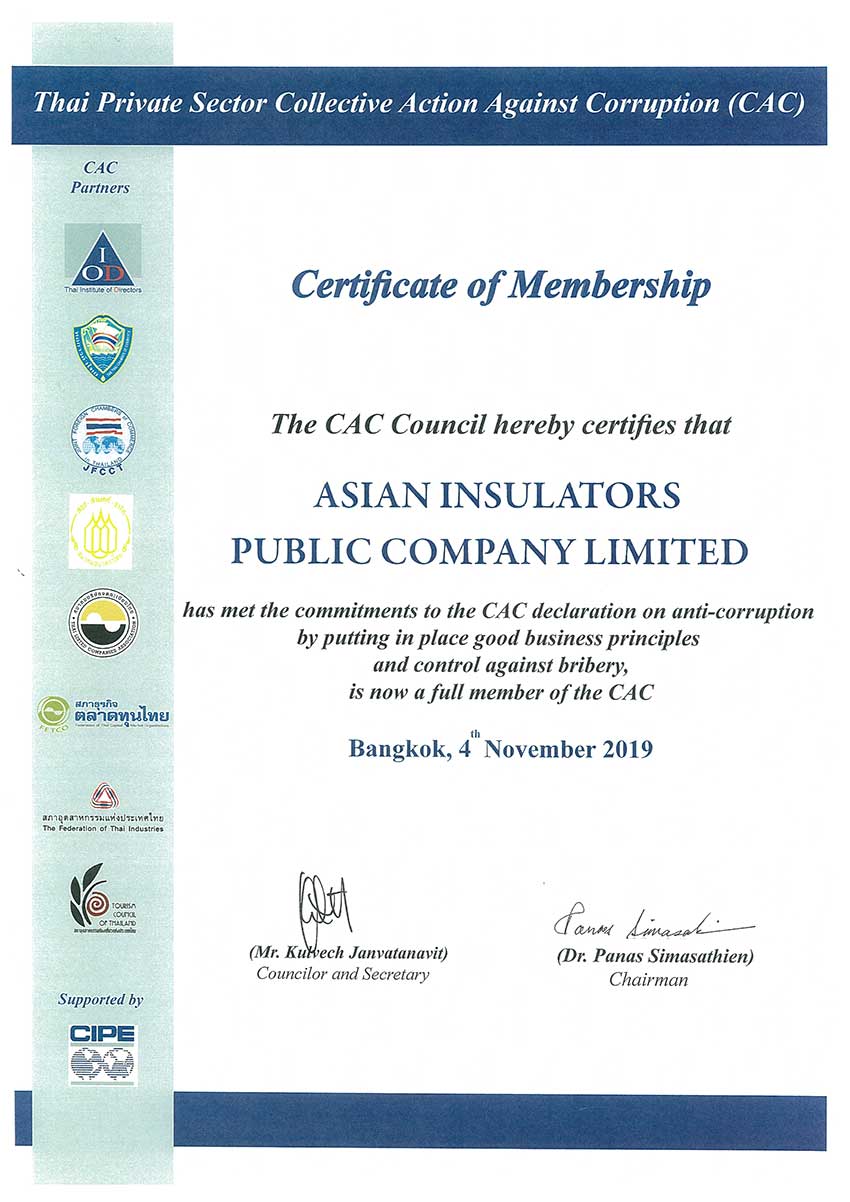 - บริษัท เอเชียน อินซูเลเตอร์ จำกัด (มหาชน) ได้รับประกาศนียบัตรผู้ผ่านกระบวนการรับรอง (CAC AWARD 2020)